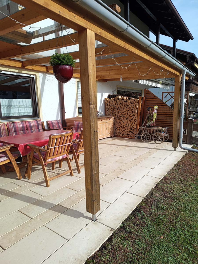 Um die Holzbalken einer Überdachung langfristig zu erhalten, wurde bei diesem Projekt ein besonders widerstandsfähiger Schutz aufgetragen. Ziel war es, eine Lösung zu schaffen, bei der in Zukunft kein Nachstreichen mehr nötig ist.