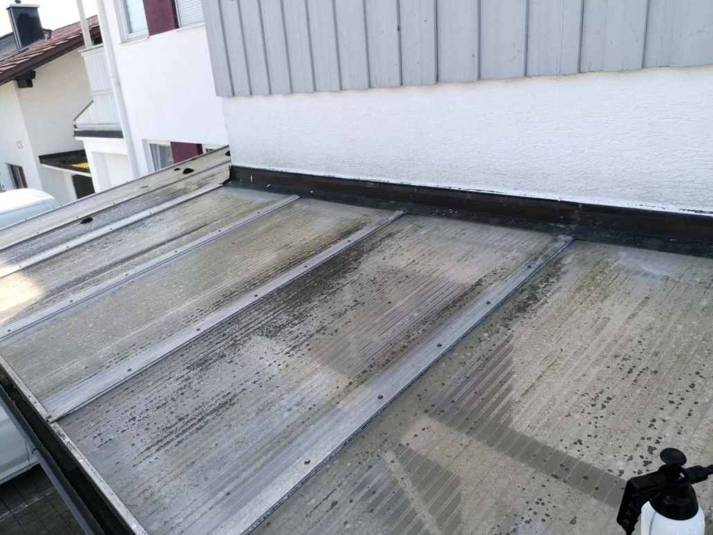 Das Vordach war stark verschmutzt und ließ nur wenig Licht durch. Mit Wasser, geeignetem Reiniger und dem nötigen Fingerspitzengefühl wurde die Fläche gründlich gereinigt.