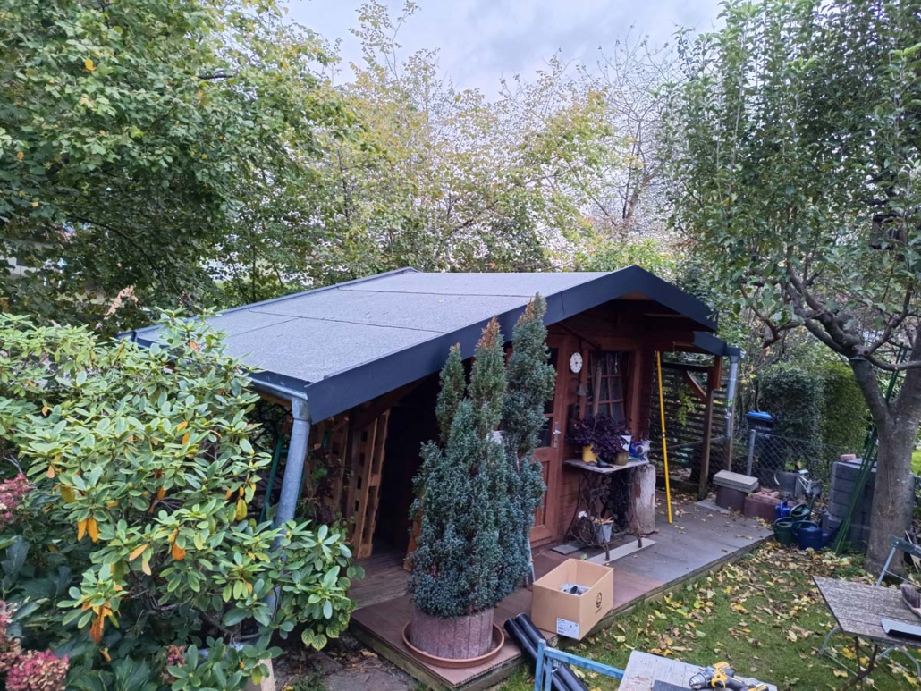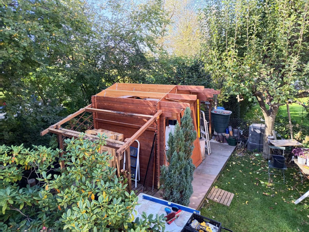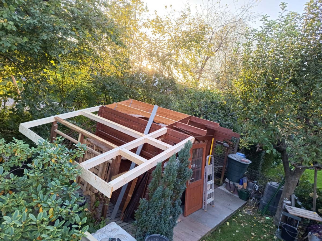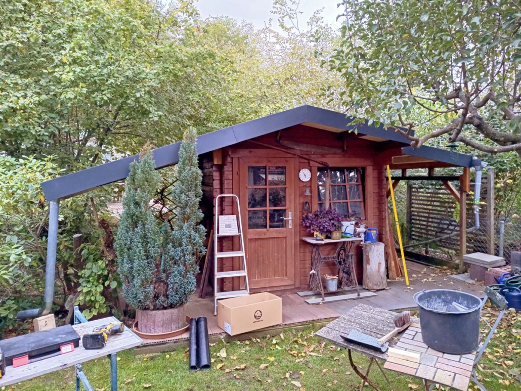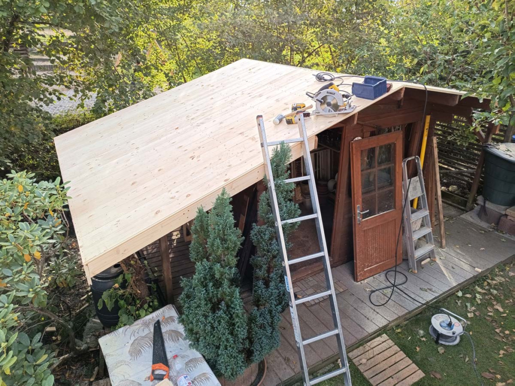 Das Dach des Gartenhäuschens war beschädigt und musste ersetzt werden. Auf Wunsch des Kunden wurde das neue Dach im gleichen Zuge verlängert – für zusätzlichen Schutz vor Witterung und mehr nutzbare Fläche rund ums Häuschen.