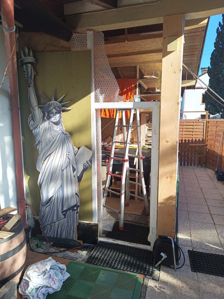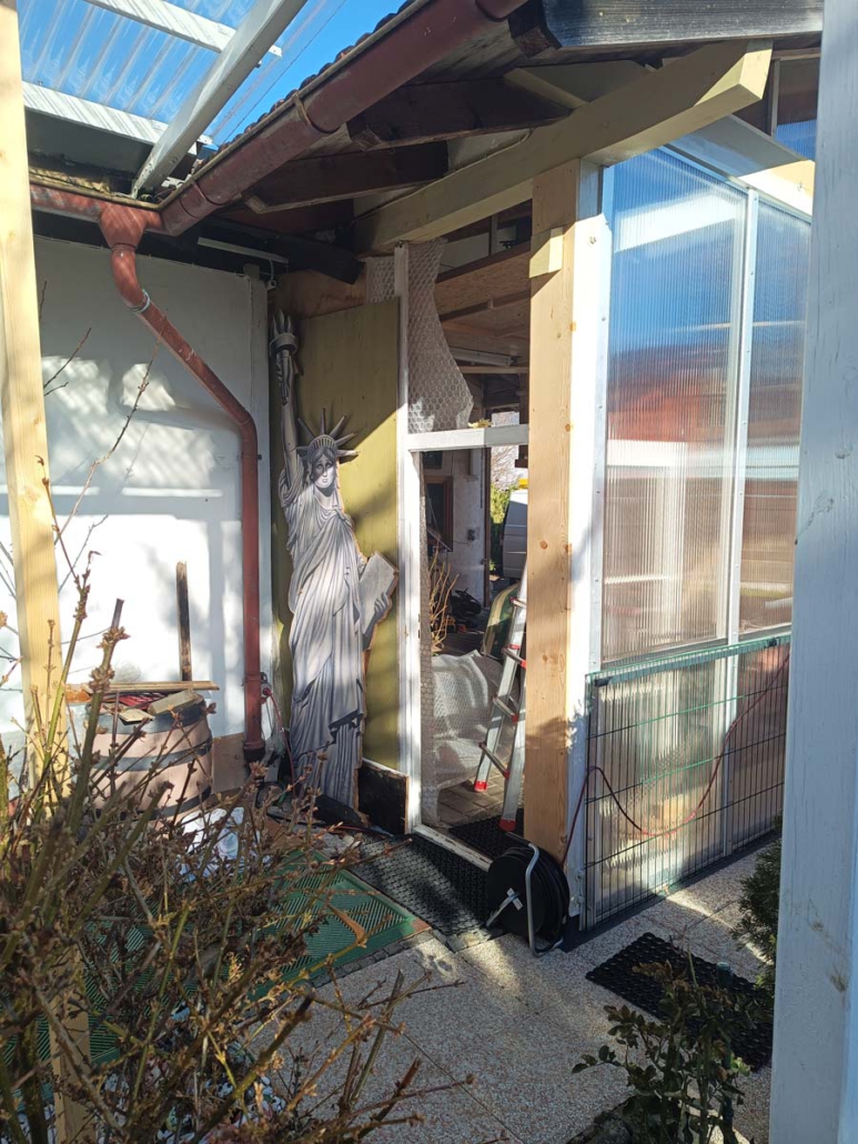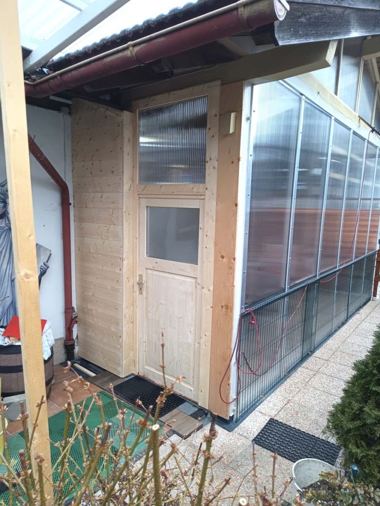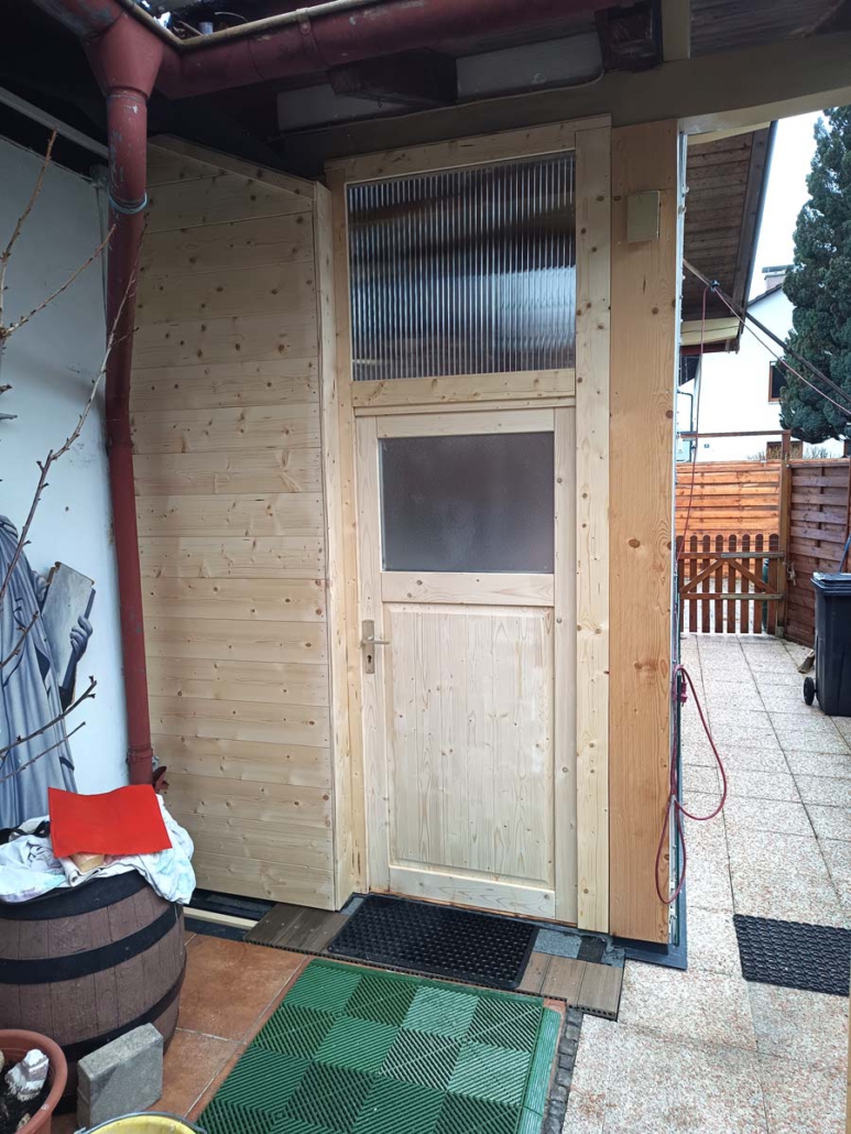 Die alte Überdachung für Feuerholz hatte ausgedient – stattdessen sollte ein funktionales Gartenhaus entstehen. Nach dem Erstellen eines soliden Fundaments wurde das vom Kunden gewählte Gartenhaus aufgebaut.