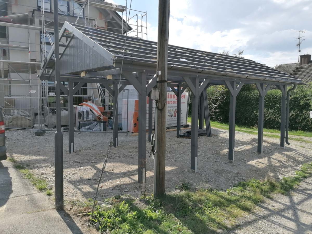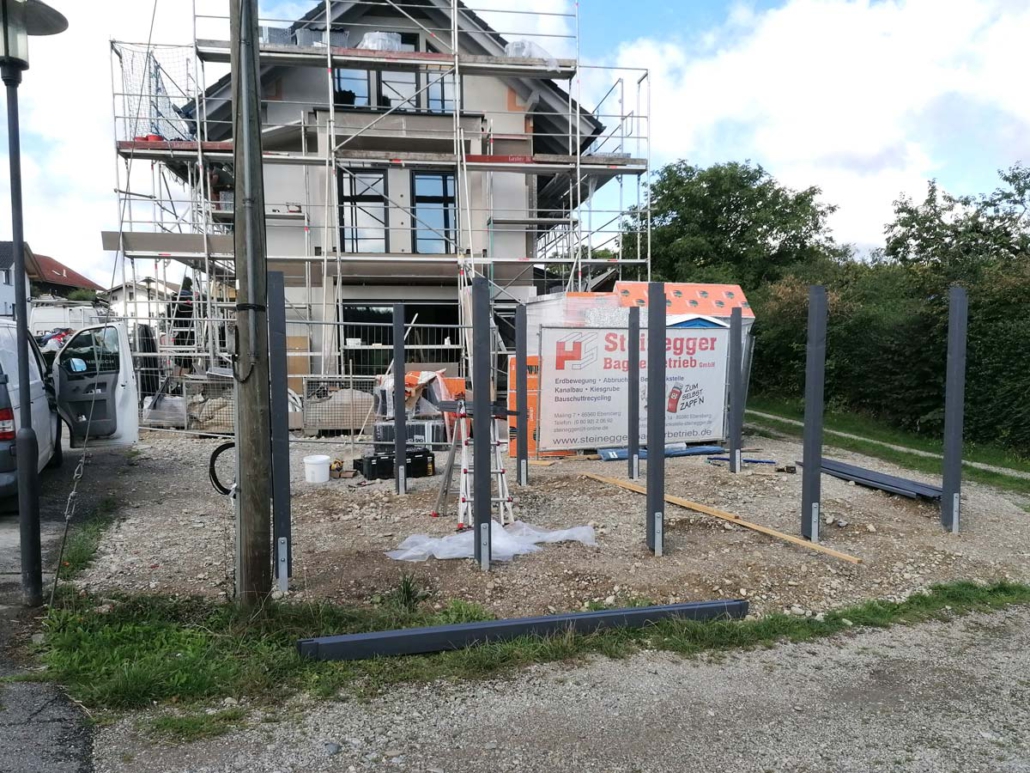 Für einen schönen Neubau wurde ein vom Kunden bestellter Carport aufgebaut. Zunächst wurden die H-Pfosten fachgerecht einbetoniert, um ein solides Fundament zu schaffen.